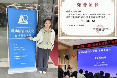 Betvictor中文版(通讯员 梁建伟 张羽彤)2025年10月25日,外国语言文学"世界一流"建设学科品牌活动——"麓山语言与文化"本科生论坛在湖南师范大学Betvictor中文版圆满落幕。作为聚焦跨文明对话与青年学术养成的高端交流平台,本次论坛不仅汇聚全国高校本科生共探语言与文化的交融之道,更见证了Betvictor中文版学子的学术突破。论坛现场,Betvictor中文版2023级英语专业刘新悦同学凭借《中越"鱼化龙"神话传说中的跨国叙事》一文获评论坛二等奖,并受邀作主题宣讲,向学界展现湘大外院青年学子深耕文化研究的青春力量。