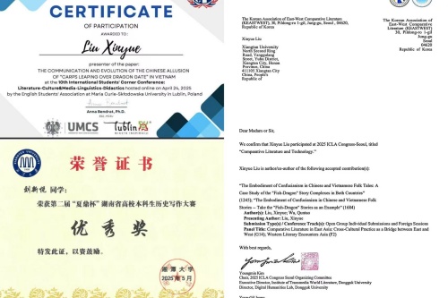 此次获奖是刘新悦深耕历史文化研究领域,持续积淀的必然结果,更始于一次“有温度的引导”。她的研究始于大二《中国哲学与文化》课堂——吴群涛老师以"外研社·国才杯"大学生外语能力大赛演讲主题"The Chinese Dragon Is Good"演讲题为引,将语言学习与文化传播深度勾连:“龙文化是中华文明的精神符号,如何用外语讲好它的故事,是当代青年的学术责任。”这番话如种子般埋入刘新悦心中——她自此开启中国龙意象跨文化传播的研究旅程,主动跨选政治学、传播学等课程,研读《中国神话史》等典籍,构建起跨学科研究框架。2024年11月,其论文《中国"鲤鱼跃龙门"典故在越南的传播及演变》获"区域国别研究与中华文化走出去"学术研讨会"优秀论文";2025年4月,她受邀在波兰居里夫人大学线上论坛用英文宣读研究成果;同年5月,经国内外学术交流打磨的《"鲤鱼跃龙门"与"鱼跃武门"——中越民间故事文化渊源》,获第二届"夏鼎杯"湖南省高校本科生历史写作大赛优秀奖,实现从“语言技能训练”到“历史文化研究与跨文化传播”的转型。